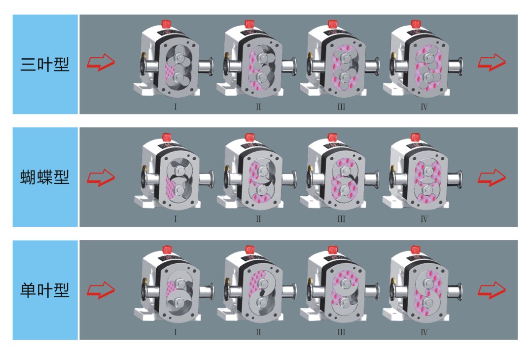 凸轮式双转子泵,蝴蝶型转子泵特别适用于再输送过程中容易起泡沫以及输送高粘度、高浓度及任何含颗粒的介质,经其输送的物料保持原有的品质部变,不起任何理化反应。